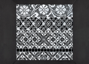 drawn thread work 2017 drawing in white ink on glass 30x30cm one of a series of drawings on glass made for Paddy's exhibition Drawn Thread Work - samplers & specimens at Customs House Gallery, South Shields from 17.11.17 to 31.03.18. This drawing is sourced from drawn thread designs in various textile collections
