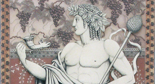 dionysus 1997 273x106 cm drawing, bonding and painting on antung and organza silks collection of leeds city council at lotherton hall Made for the In Arkadia touring exhibition. It represents a statuesque Dionysus with his rhyton and thursus standing on an altar draped with some of his other attributes.